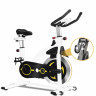 Спин-байк RAVS белого цвета имеет прочную стальную раму, что повышает его устойчивость и обеспечивает быструю езду. Он также оснащен большим алюминиевым маховиком с инерционным весом 19 кг, который обеспечивает дополнительный импульс и реалистичные ощущения от езды с препятствиями. Максимальный вес пользователя до 150 кг.