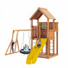 Игровая площадка изготовлена из клееного соснового бруса и массива сосны .Дерево обработано безопасной декоративно-защитной пропиткой. Технология значительно увеличивает срок службы конструкций, повышает прочность древесины, защищает её от гниения и грибков.