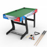 Многофункциональный игровой стол MERCURIAL 4ft — то, что нужно для большой компании! Играйте в футбол, бильярд, настольный теннис и аэрохоккей на одном столе, легко меняя игровые поля. Яркое оформление и стильный дизайн сделают игру ещё более увлекательной. Особенности стола Игровое поле Игровые поля легко менять, они изготовлены из МДФ, ламинированного ПВХ с ярким принтом игровой разметки. Сам стол компактный, не занимает много места, а игрового пространства достаточно, чтобы получить настоящее удовольствие во время игры в домашней обстановке с друзьями или семьёй. Толщина бортиков стола 30 мм, а высота - 12 мм. Размеры и оформление игрового поля Футбольное поле: 104 х 58 см, толщина 3 мм, с зелёной поверхностью и разметкой, установлены телескопические хромированные стержни 13 см в диаметре с футбольными игроками. Хоккейное поле: размер 93 х 47,5 см, толщина 4,75 см, покрытие бело-красное, с разметкой. Теннисный стол: классическое синее поле с разметкой для сетки 96 х 50 см, толщина 4,75 мм. Бильярдное поле: стол с мягким зелёным покрытием размером 97 х 51 см, толщиной 4,75 мм; ширина лузы 6,7 см. Ножки стола Конструкция стола устойчива, что актуально для азартных и эмоциональных игроков, особенно при игре в футбол. Прочность и устойчивость ему придают ножки шириной 80 мм и толщиной 13 мм из МДФ с ПВХ покрытием и перекладины толщиной 9 мм. Комплектация Стол для домашних игр 4 в 1 поставляется со всеми комплектующими: 2 мяча для футбола; 2 шайбы и 2 биты (6 см в диаметре) для хоккея; 2 ракетки, 2 теннисных мяча и сетка; 2 кия (91 см), шары (37 мм в диаметре), треугольник и щётка для бильярда. Не нужно ничего приобретать отдельно: играть можно сразу после покупки. А механический счётчик голов на полях для футбола и хоккея сделают игру ещё увлекательнее.